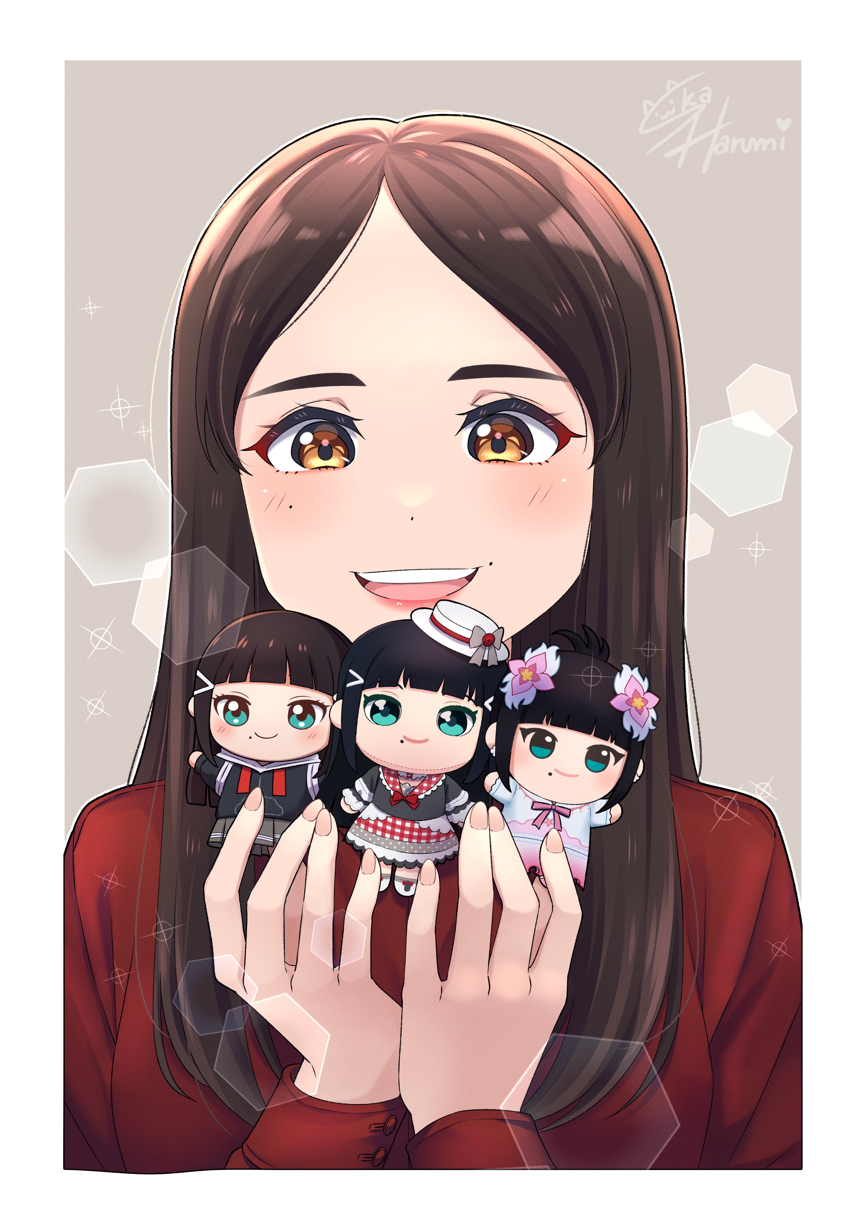 1girlanimificationaqua eyesblack hairblack hoodieborderbrown eyeschibigurumidollgrey backgroundhatholdingholding dollhoodhoodielong sleevesmolemole beside mouthmole under eyemole under mouthmultiple molesred shirtshirtsidelockssignaturesimple backgroundsolovoice actorvoice actor connectionwhite borderwhite hat