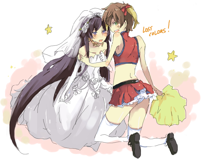 00s2boysblack hairbridecheerleadercrop topcrossdressingcrossdressing (mtf)dresslong hairmale bridemidriffminiskirtmultiple boyspom pom (cheerleading)skirtthighhighsvery long hairwedding dressyaoi