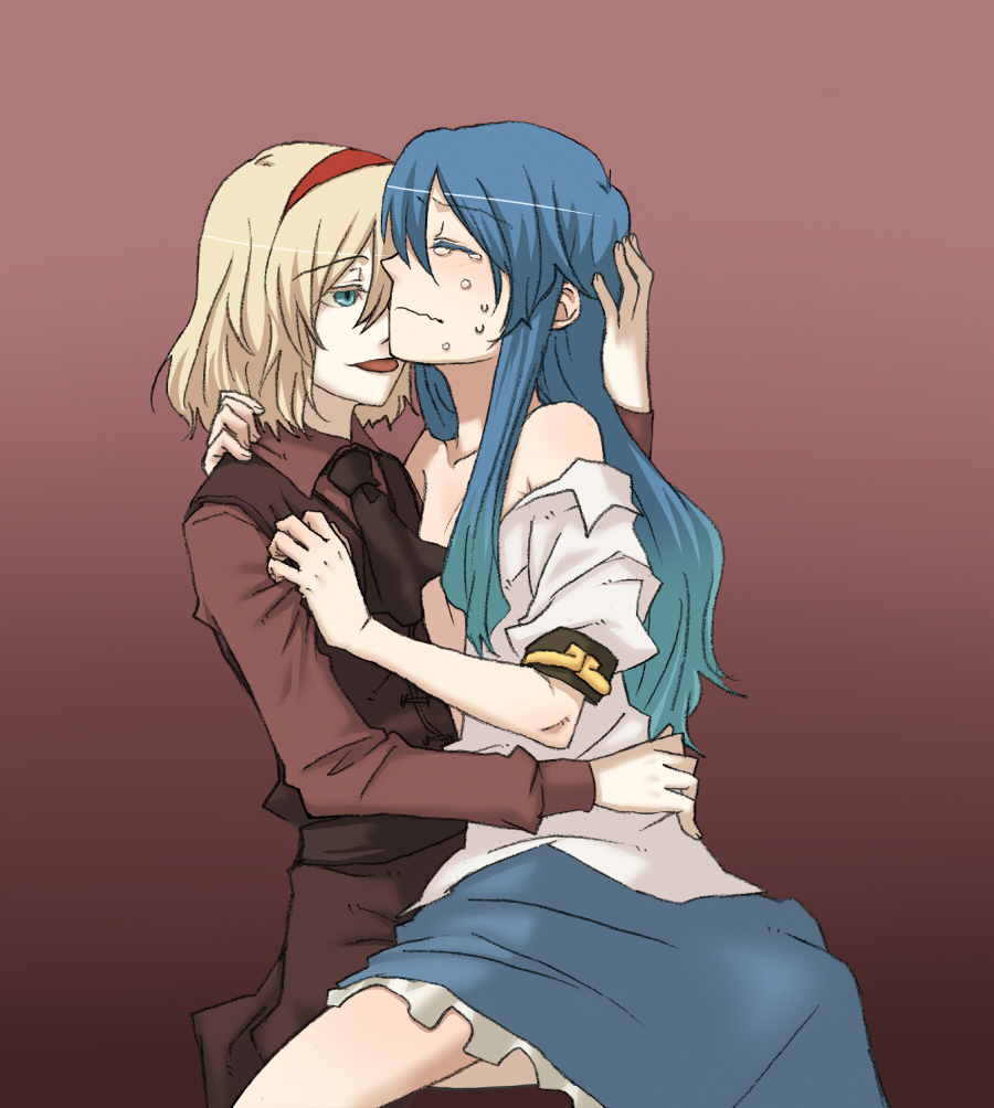 2girlsalternate colorbare shouldersblonde hairblue eyesblue hairblushclosed eyesclothes grabcryingfemale focusflat chestfrottagegirl on tophairbandhand on another's headhugimminent kisslickinglong hairmoaningmultiple girlsnaked shirtnaughty facenecktieopen clothesopen shirtplayer 2shirtshort hairstraddlingtearstonguevestwavy mouthyuri
