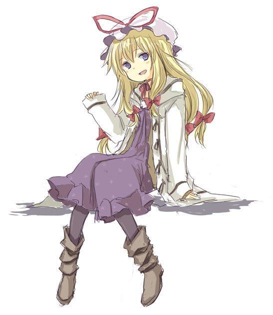 1girlaged downblonde hairfemale focusfull bodyhatlong hairpantyhosepurple eyesribbonsolowhite background
