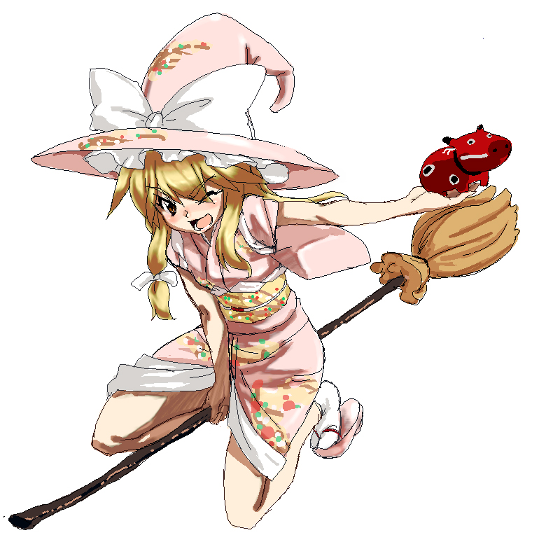 1girlalternate colorblonde hairbroombroom ridingfemale focushatjapanese clotheskimonooekakisolowitchwitch hatyukata