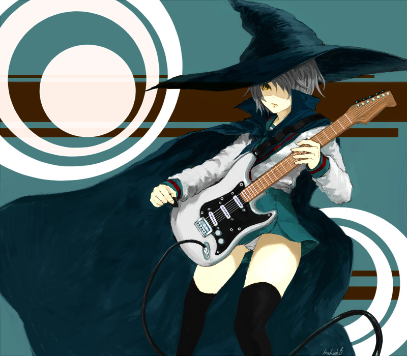 00s1girlcapeelectric guitarfemale focusguitarhatinstrumentschool uniformserafukuskirtsolothighhighswitch hatyellow eyes