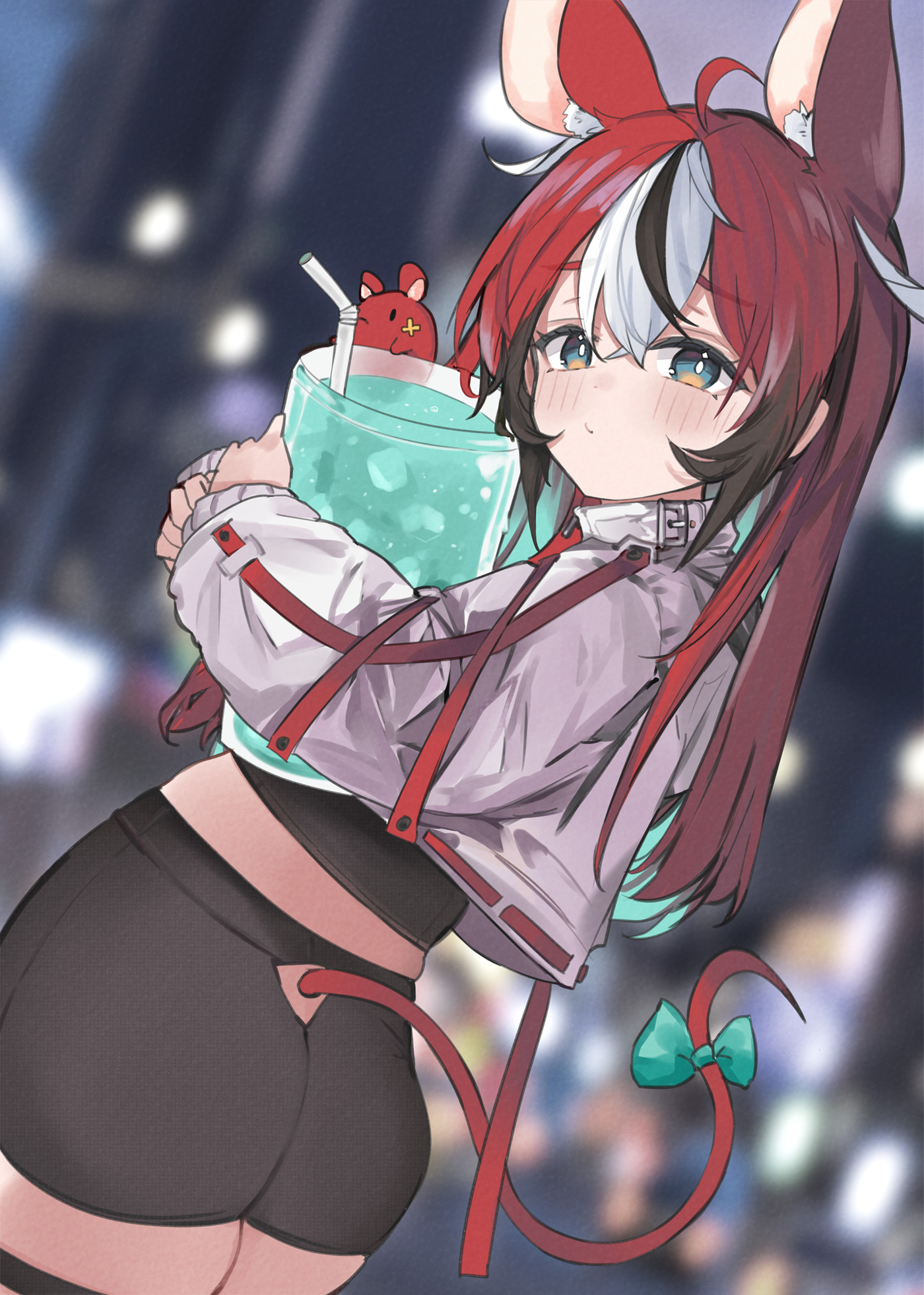 1girlahogeanimal ear fluffanimal earsassblack hairblack shirtblack shortsblue eyesblurryblurry backgroundbowclothing cutoutcolored tipscropped jacketcrossed bangsdouble-parted bangsextra earshair between eyesholdingjacketmouse earsmouse girlmouse tailmulticolored hairoutdoorsred hairshirtshort shortsshortssolostreaked hairtailtail bowtail ornamenttail through clothesvirtual youtuberwhite hairwhite jacket