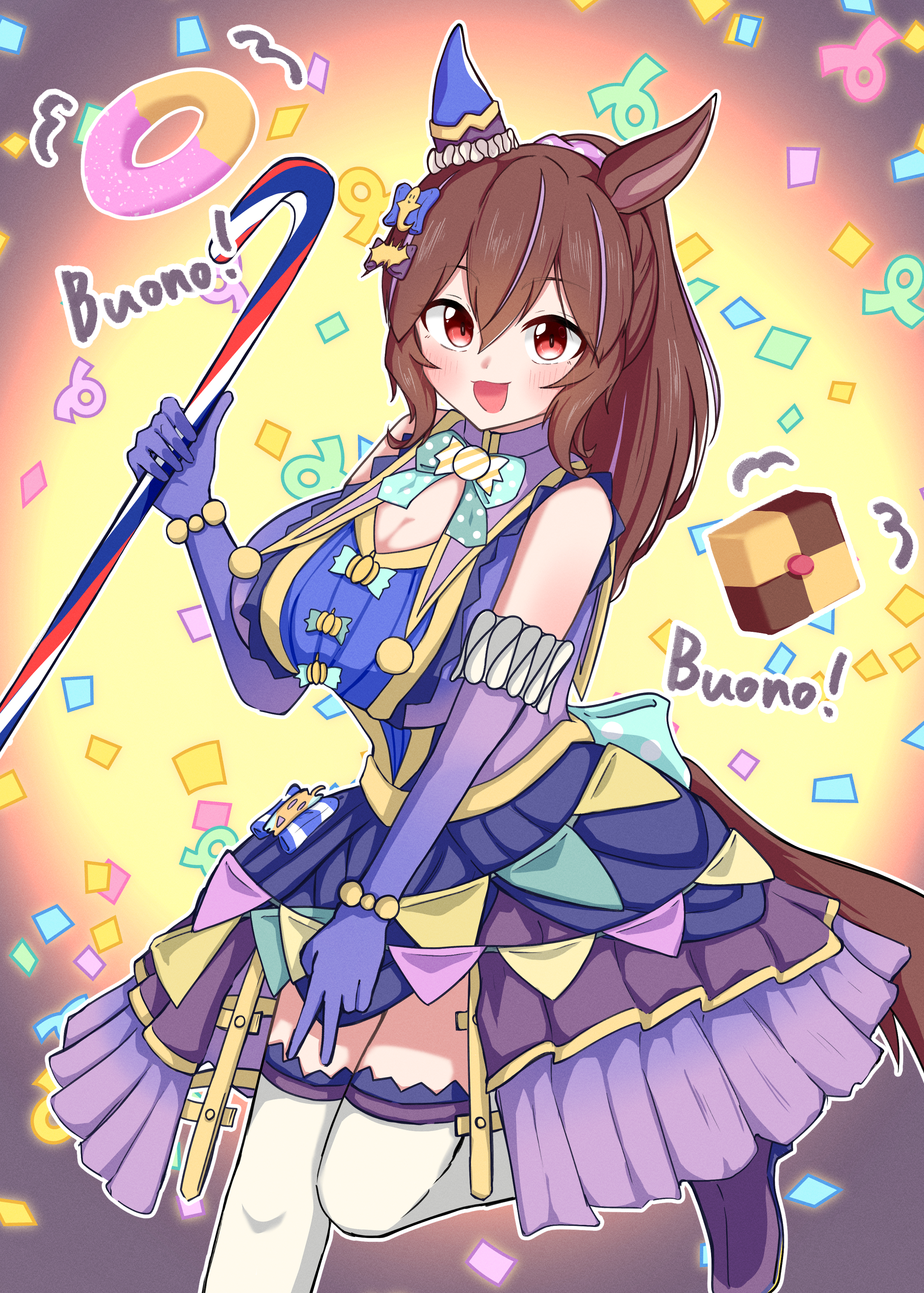 1girlanimal earsblue glovesblushbowbreastsbrown haircanecleavageconfettidonutdressear coverselbow glovesfoodglovesgreen bowhair between eyeshair ornamenthair scrunchieholdingholding canehorse earshorse girlhorse taillarge breastslong hairlooking at viewermulticolored hairofficial alternate costumeopen mouthpink eyesponytailpurple dresspurple glovespurple hairred eyesscrunchieshirtshoessingle ear coverskirtsleevelesssmilesolostreaked hairtailthighhighswhite thighhighs