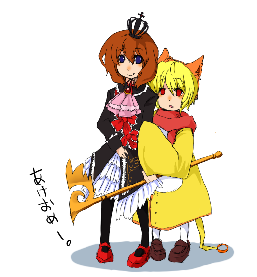00sakeomeanimal earsblonde hairblue eyeschilddressfrillshappy new yearnew yearpantyhosered eyesred hairribbonstaff
