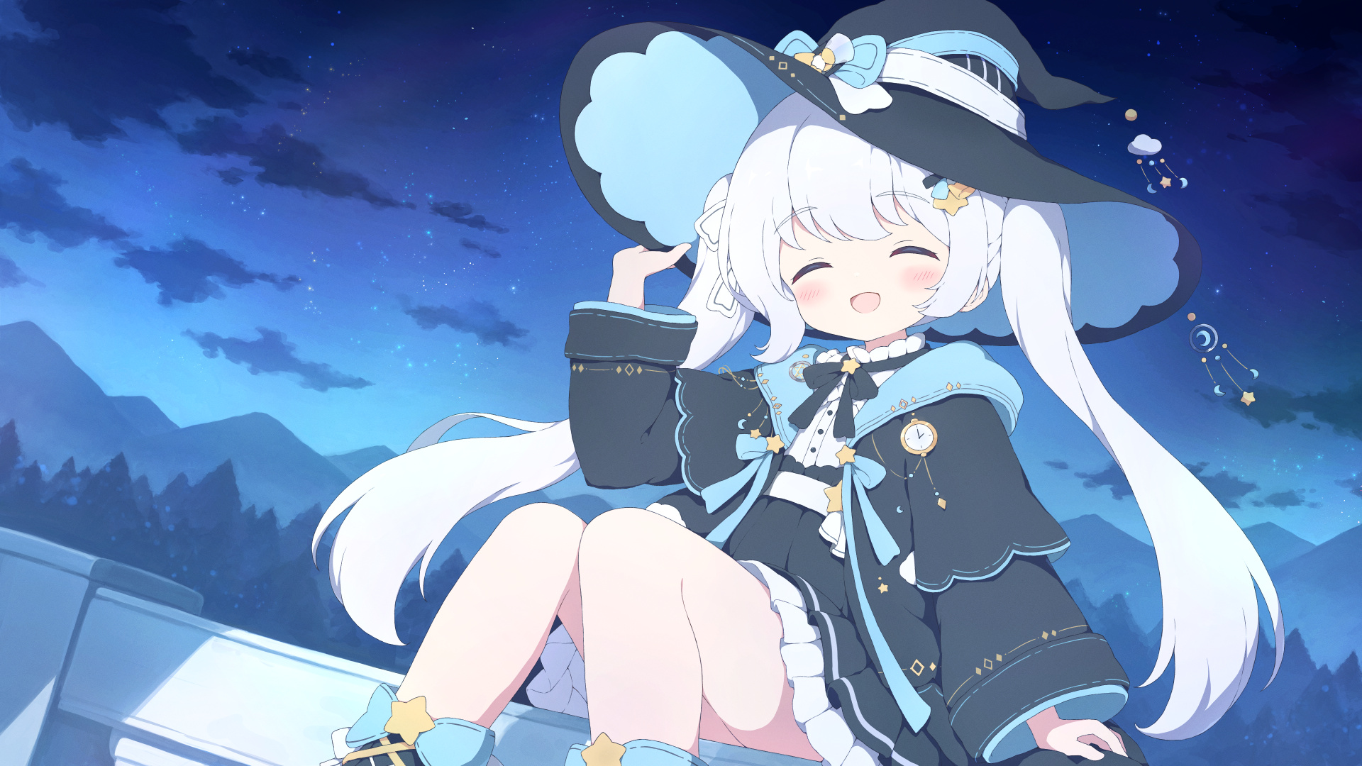 1girladjusting clothesadjusting headweararm supportblack bowblack bowtieblack jacketblack skirtblue skyblue trimblushbowbowtieclosed eyescloudfeet out of framehair ornamenthathat ribbonjacketlayered sleeveslong hairlooking at viewermountainous horizonnightnight skyopen mouthoutdoorspleated skirtribbonshirtshooting star hair ornamentsittingskirtskysmilesolostar (sky)star (symbol)star hair ornamentstarry skythighstreetwintailsvery long hairwhite hairwhite ribbonwhite shirtwitch hat