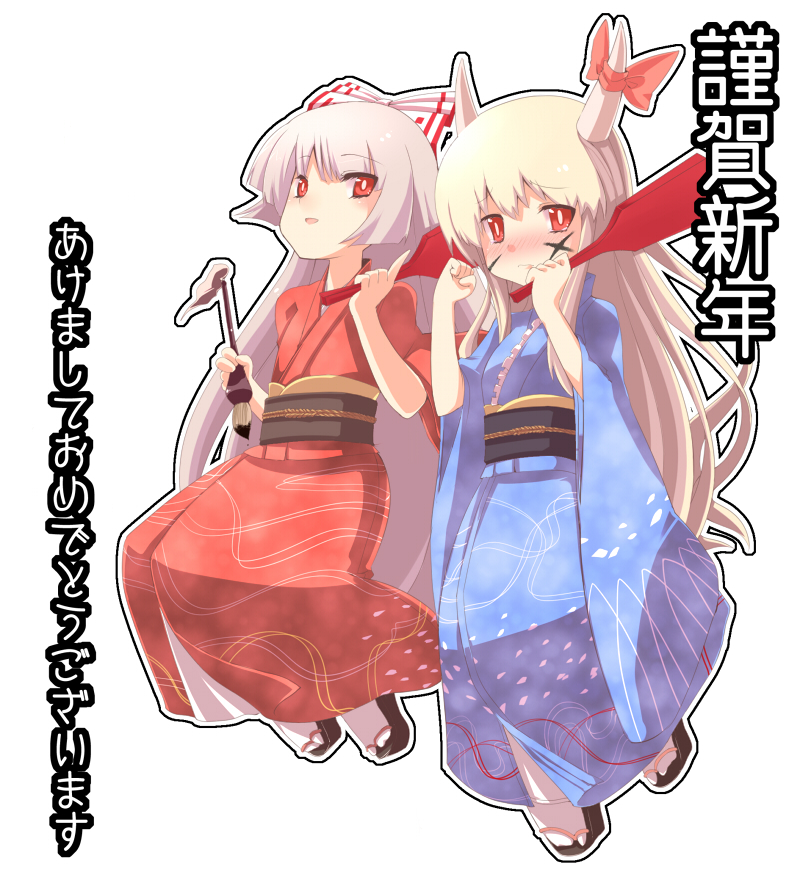 milk crepes, ijichi nijika, yamada ryo, bocchi the rock!, highres, 2girls, ahoge, blonde hair, blue hair, dress, flower, hair ornament, long hair, long sleeves, looking at viewer, mole, mole under eye, multiple girls, plaid clothes, plaid dress, shoes, short hair, side ponytail, sneakers, socks, vest