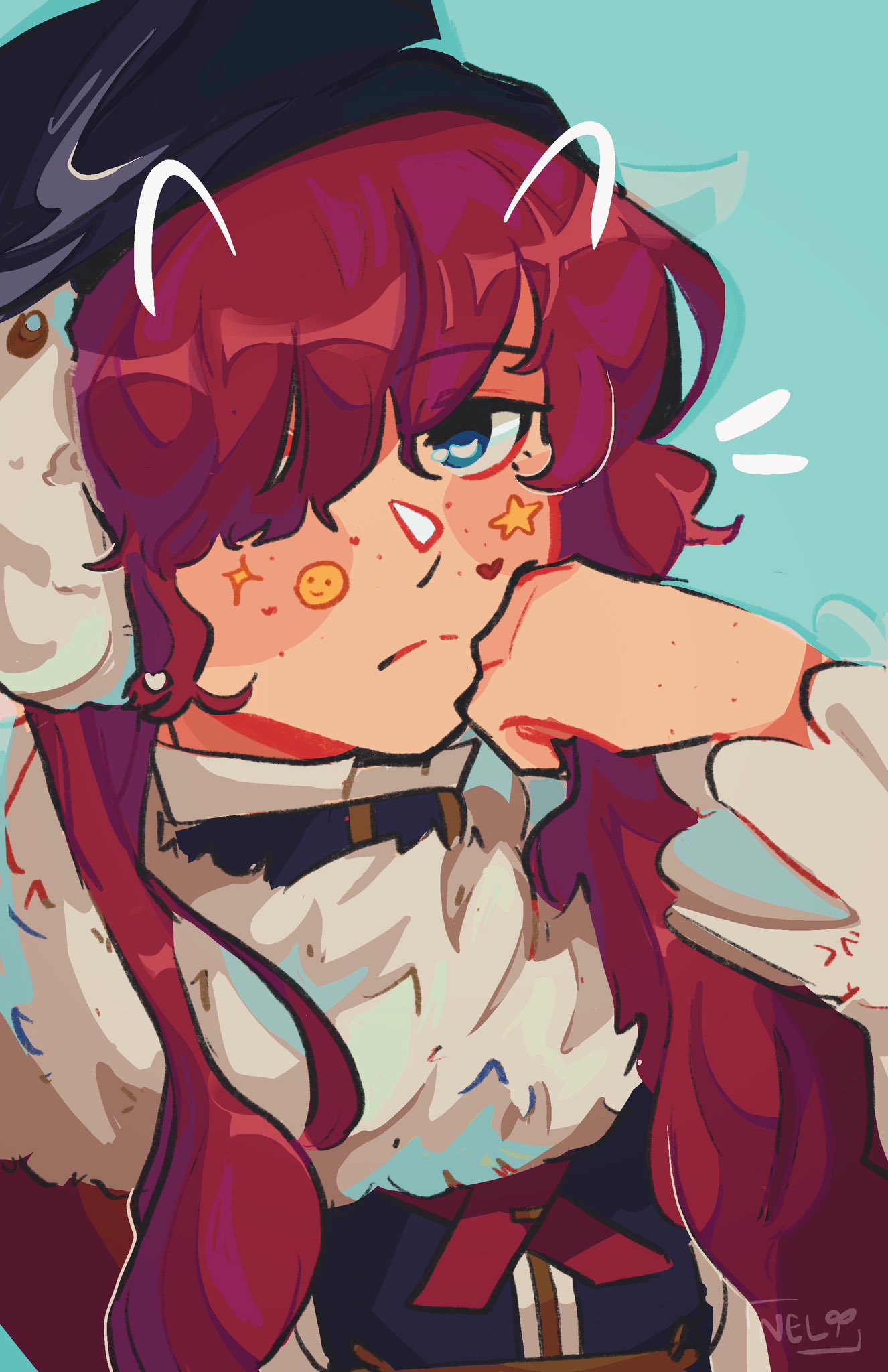 1girlaqua backgroundblack hatblack vestblue eyescapeclosed mouthcovered eyescross tiedrawn earsdrawn whiskersfacial markfur trimfur-trimmed capehair over one eyehand on own cheekhand on own facehand uphatlong hairlooking at viewerone eye coveredportraitred capered hairshirtsolostar (symbol)star facial markvestwhite shirt