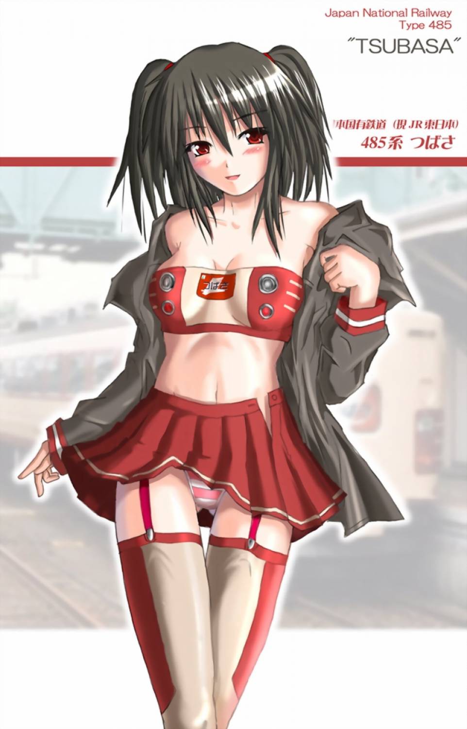 hayashi sakura, hiiragi kagami, lucky star, 00s, blush, cheerleader, collarbone, hair ribbon, hand on own hip, hip focus, long hair, pleated skirt, pom pom (cheerleading), purple eyes, purple hair, ribbon, skirt, solo, tsurime, twintails