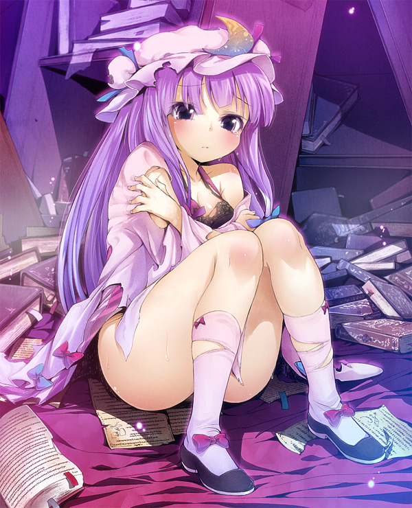 1girlbookbottomlessbowbracrescentcrescent hat ornamentfemale focushathat ornamentlingerielong hairno pantiespurple eyespurple hairshoessittingsockssolotorn clothesunderwear