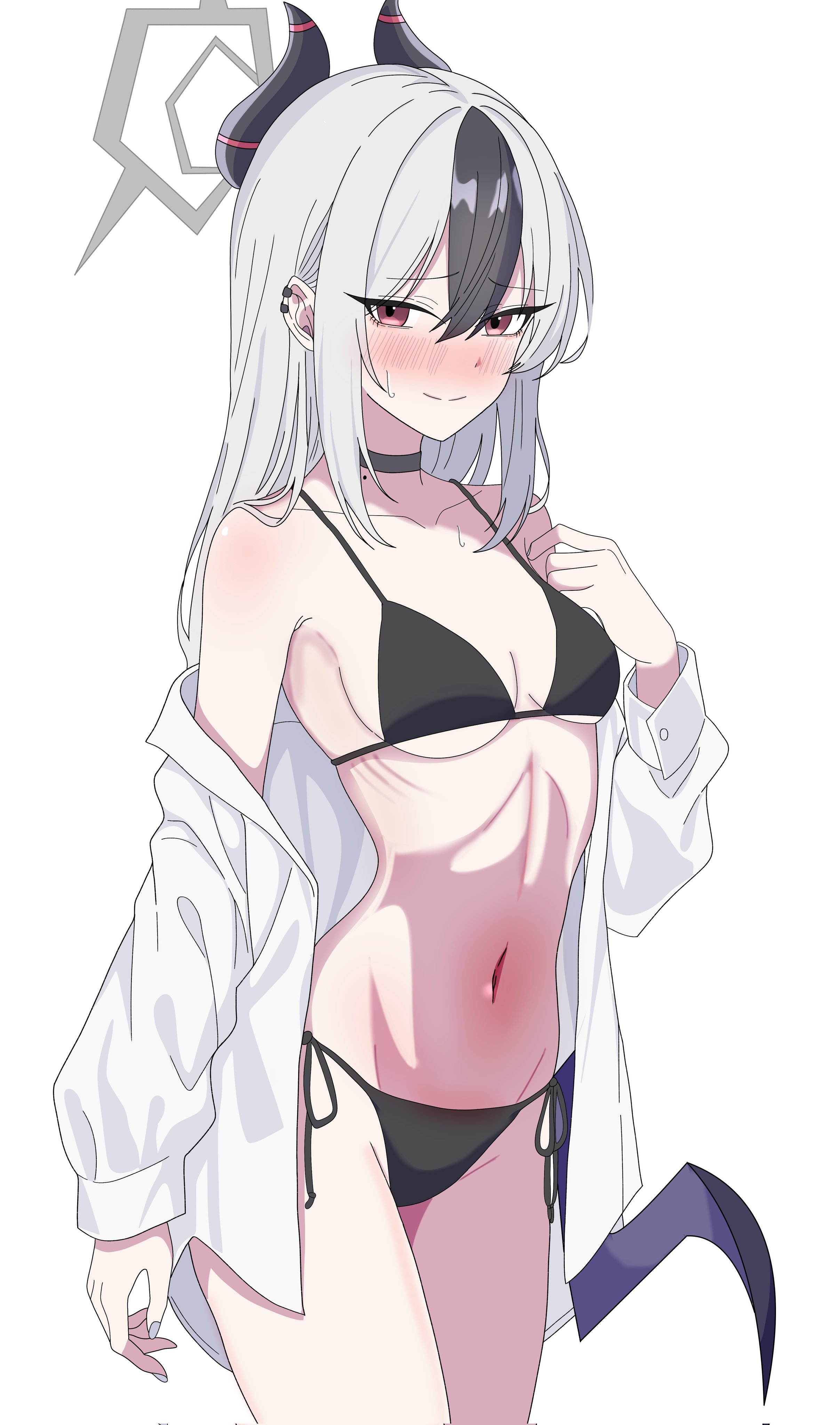 shakomori w, aubrey (headspace) (omori), aubrey (omori), omori (omori), omori, highres, 1boy, 1girl, antenna hair, arm support, barefoot, black hair, black socks, black tank top, blue shirt, blush, bow, closed eyes, closed mouth, colored skin, hair bow, long hair, looking at viewer, open mouth, purple bow, purple hair, shirt, short sleeves, shorts, sitting, smile, socks, tank top, white shorts, white skin