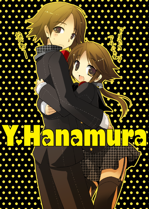 hayakawa harui, takamachi nanoha, yuuno scrya, lyrical nanoha, mahou shoujo lyrical nanoha, 00s, 1boy, 1girl, :d, backpack, bag, breasts, dress, female focus, ferret, long sleeves, open mouth, simple background, small breasts, smile, solo, turtleneck, twintails, waving, white background, yellow dress