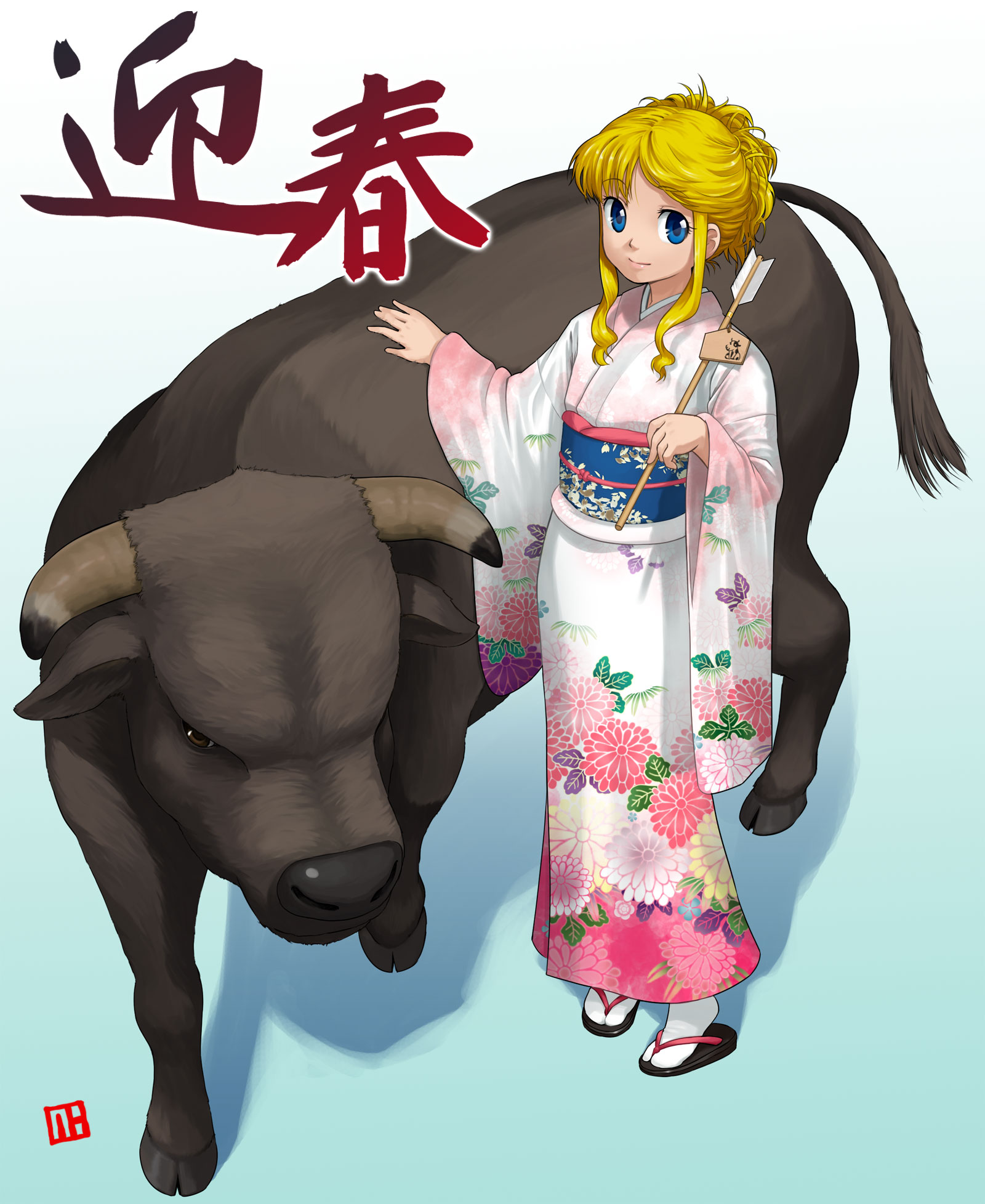 00s1girl2009arrow (projectile)blonde hairblue eyesbullfemale focusfull bodyhamayajapanese clotheskimononew yearsandalssmilesolostandingtabi