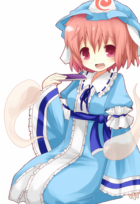 :d1girlblushcollarfemale focusfolded fanfolding fanfrillsghosthand fanhatjapanese clotheskimonolooking at viewermob capopen mouthpink eyespink hairred eyessittingsmilesolotaremetriangular headpiece