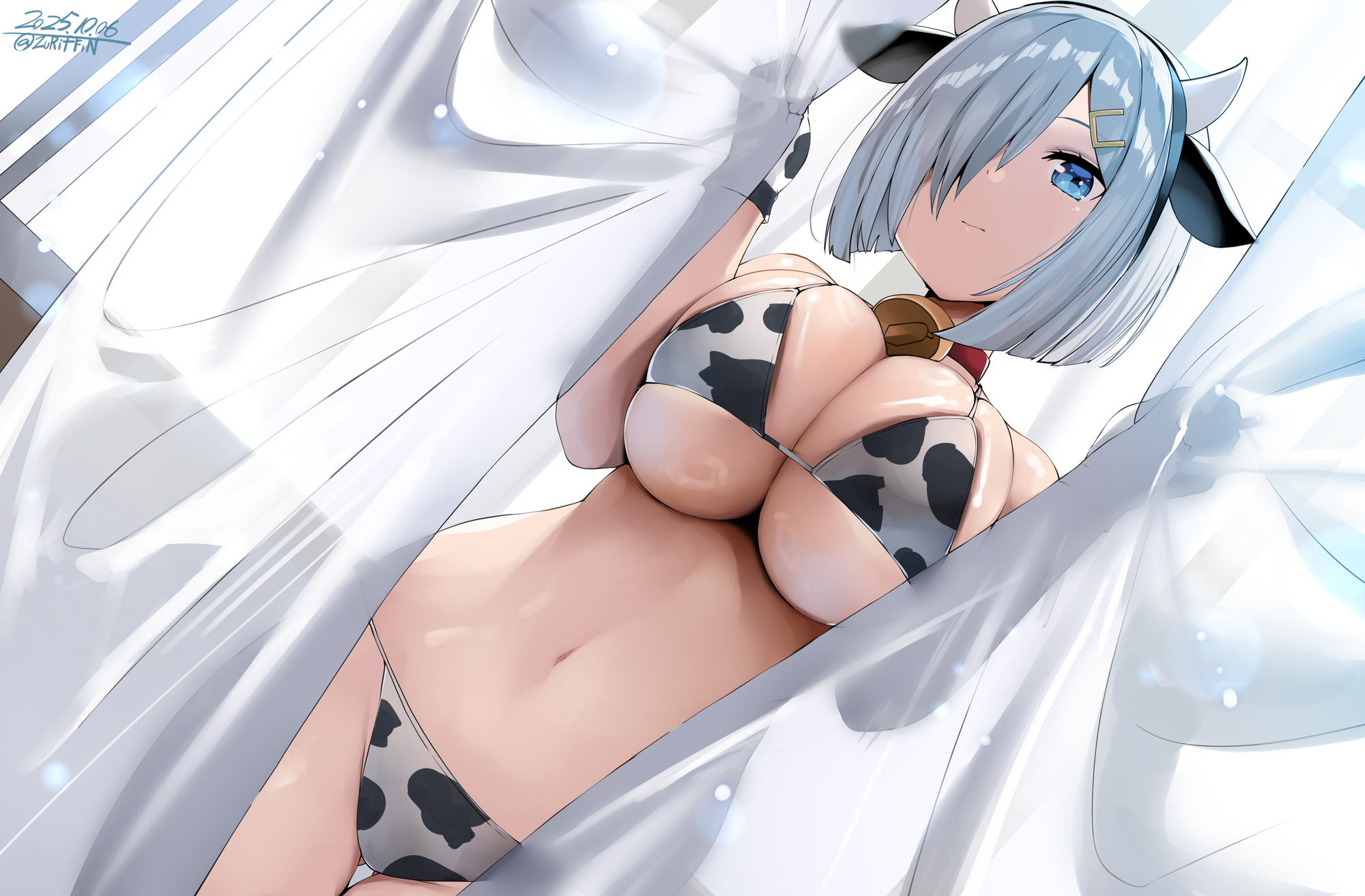 1girl2025animal collaranimal earsanimal printbikiniblack bikiniblue eyesbreastscleavagecollarcollarbonecow earscow hornscow printcow print bikinicowbellcurtainsdatedexpressionlessfake animal earsfake hornsglovesgrey hairhair ornamenthair over one eyehaircliphornslarge breastsmulticolored bikininavelprint bikinishort hairsideboobstomachswimsuitthighsunderboobwhite bikiniwhite gloveswide hips