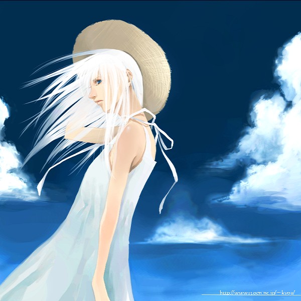 1girlblue eyesblue skyclosed mouthcowboy shotdressexpressionlessfrom sidehatlipslong hairlooking at viewerlooking to the sideoceanoutdoorsskysleevelesssleeveless dresssolostraw hatsun hatsundresswatermarkweb addresswhite dresswhite hair