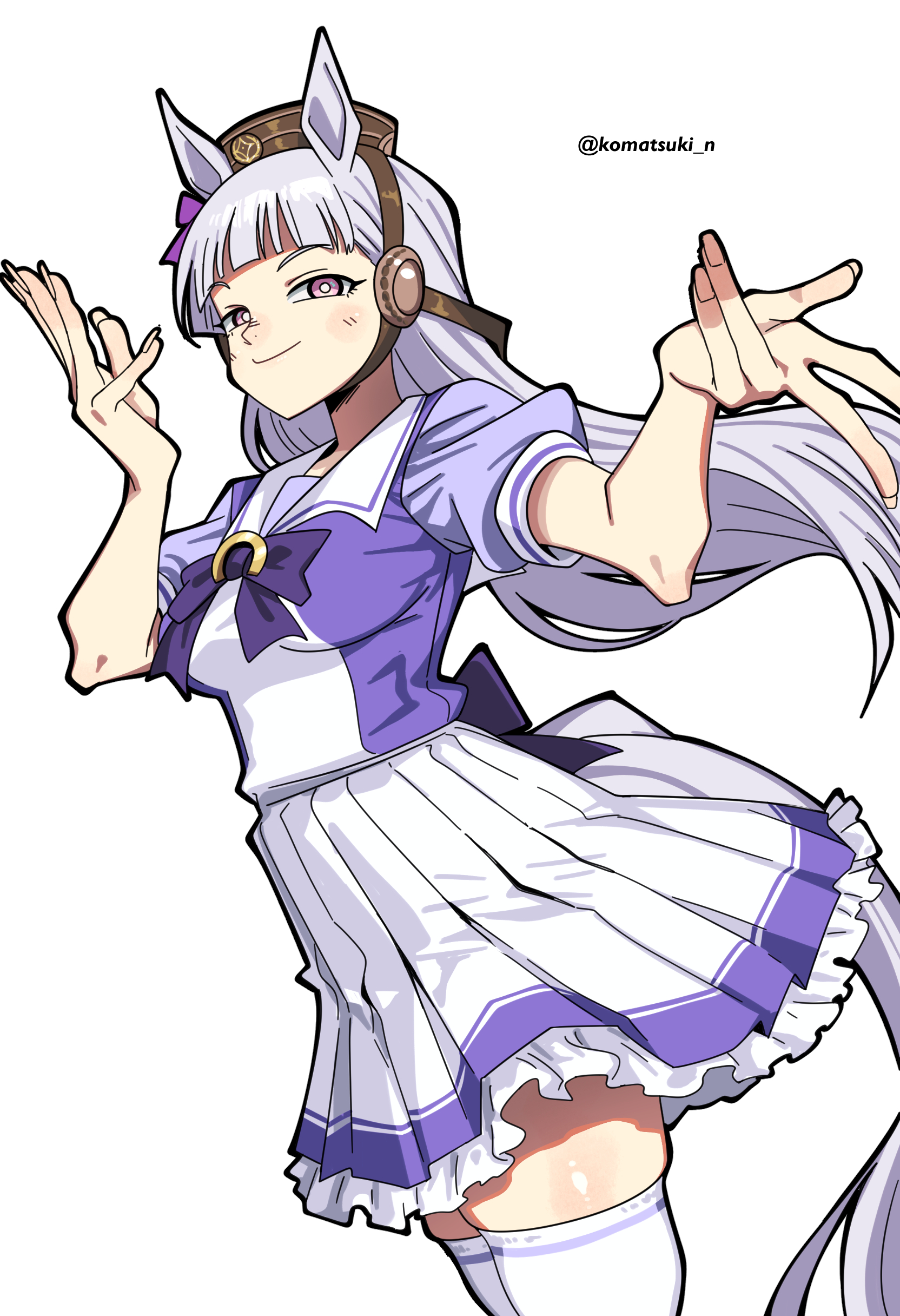 1girlanimal earsbowhorse earshorse girlhorse taillong hairlooking at viewerpleated skirtschool uniformshirtshort sleevessimple backgroundskirtsmilesolotailthighhighstracen school uniformwhite backgroundwhite skirtwhite thighhighs