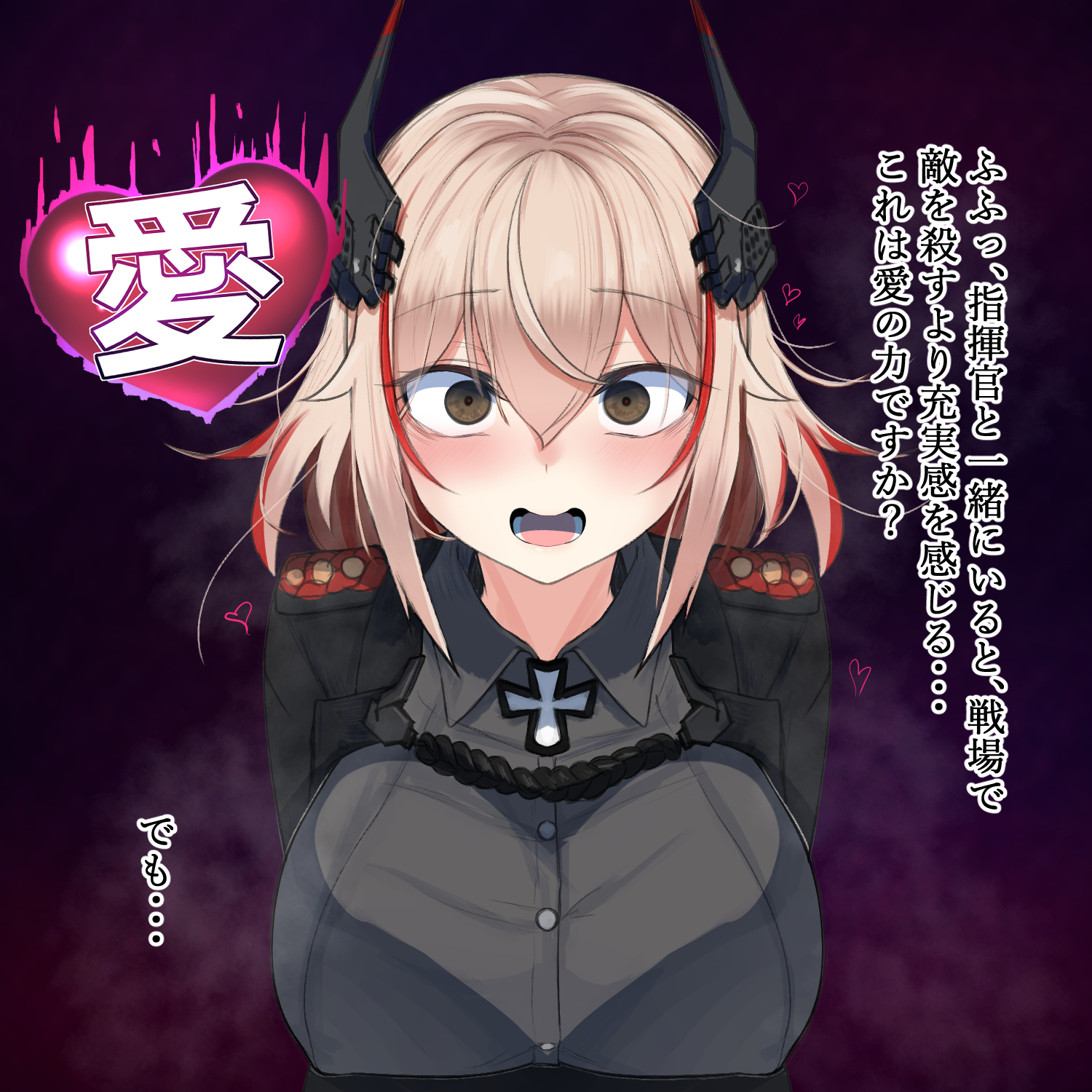 1girlblack jacketblonde hairbreastsbrown eyesbuttonschest strapcollared shirtcrossdark backgroundgrey shirthair between eyeshearthornsjacketlarge breastslooking at viewermechanical hornsopen clothesopen jacketopen mouthraised eyebrowsred streaksshirtshort hairshoulder boardsyandere