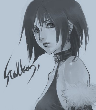 1girlbreastscharacter namechokerclosed mouthearringsexpressionlessfur trimfur-trimmed sleevesgreyscalejewelrylipslooking at viewermedium breastsmonochromeshort hairsimple backgroundsolotank topupper body