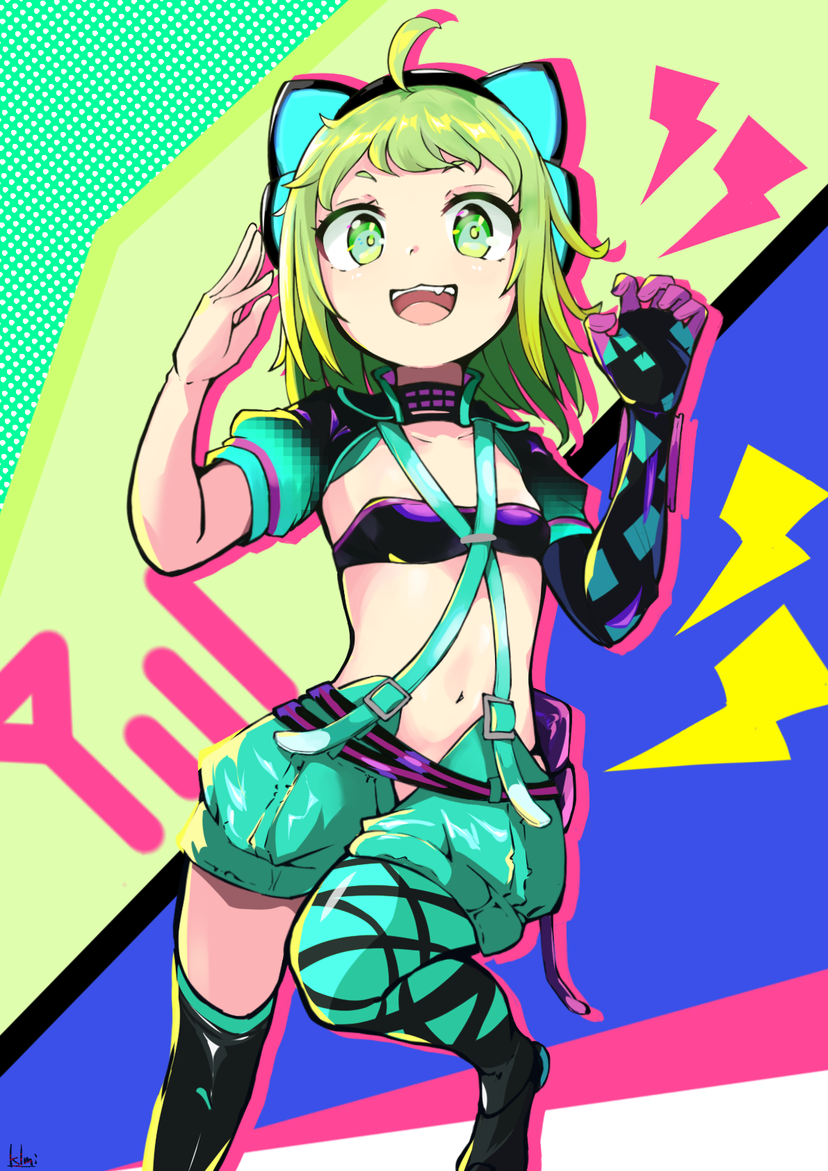 1girlahogeanimal ear headphonesanimal earsartist namebootsbreastscat ear headphonescat earschokercollarboneelbow glovesfake animal earsglovesgreen eyesgreen hairhands upheadphonesklmi chromalightning bolt symbollooking at viewernavelopen mouthpetitepurple tube topshrug (clothing)single elbow glovesmall breastssolostandingstrapstraplesssuspendersteethtube topupper teeth only