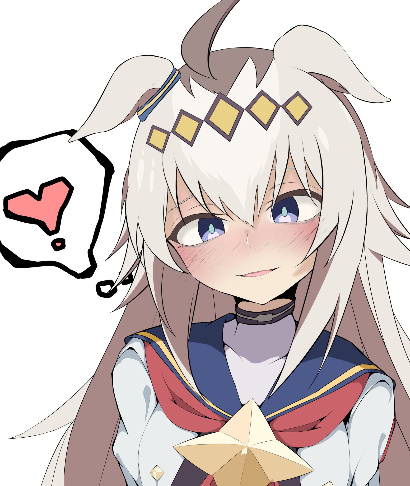 1girlahogeanimal earsblue eyesear ornamentgrey hairhair between eyeshair ornamenthairbandhorse earshorse girlhorse taillong hairlong sleevesmulticolored hairsailor collarsailor shirtschool uniformshirtsolotail