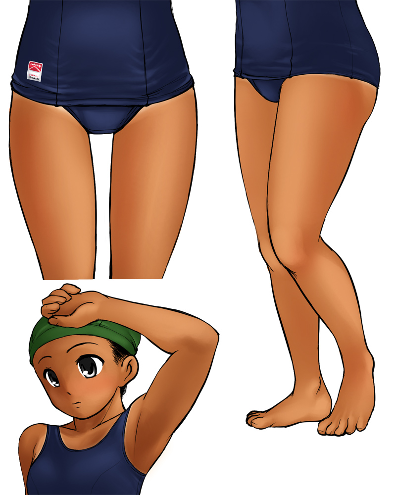 1girlarmpitsbarefootblack eyesblack hairclose-updark skindark-skinned femalefeetone-piece swimsuitone-piece tanschool swimsuitsimple backgroundstandingswimsuittantanlinewhite background