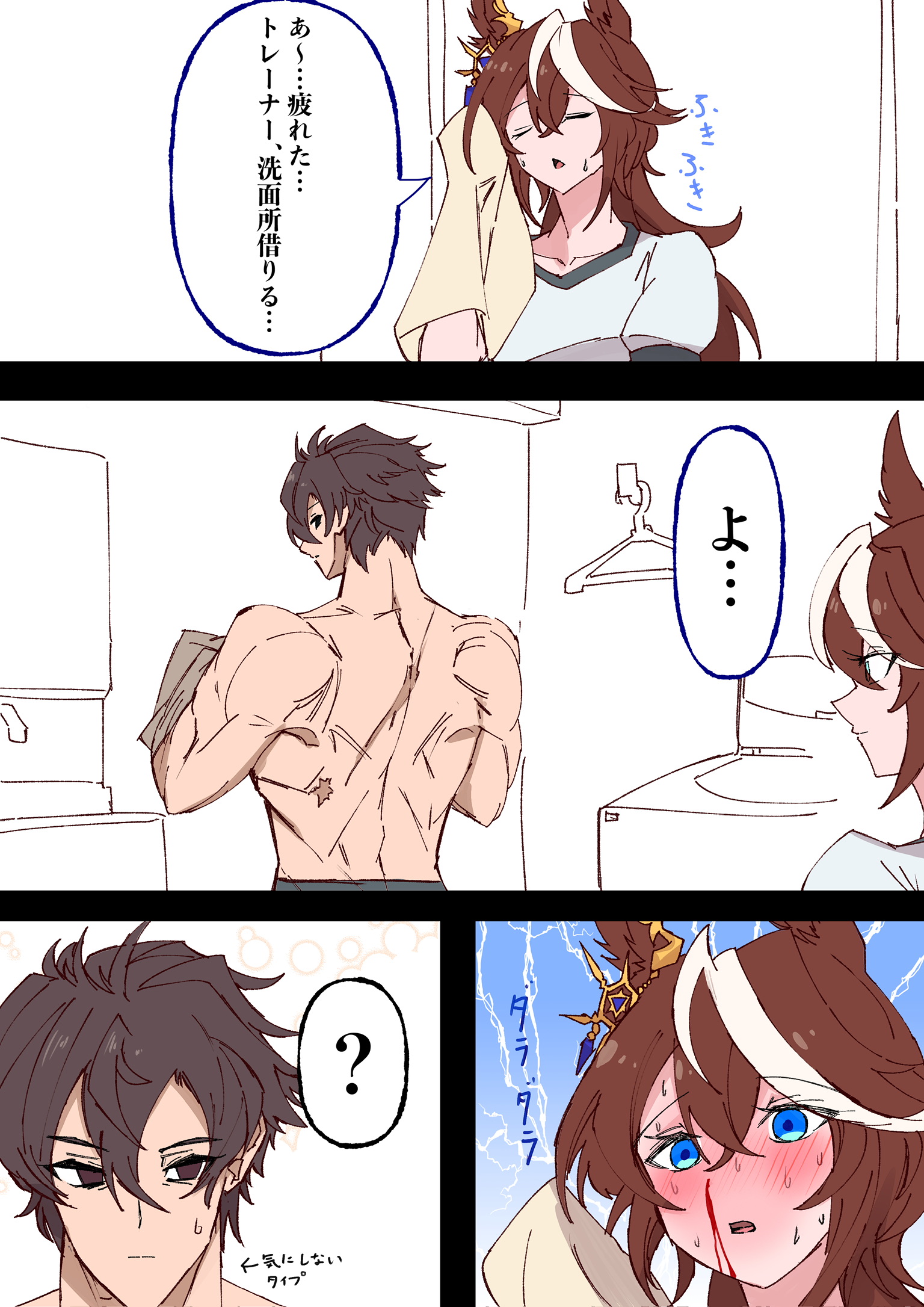 1girlanimal earsbloodblue eyesblushbowbrown hairear ornamentear ribbonhair between eyeshorse earshorse girlhorse taillong hairmojyomulticolored hairnosebleedopen mouthponytailshirtstreaked hairtailtwo-tone hairwhite hair