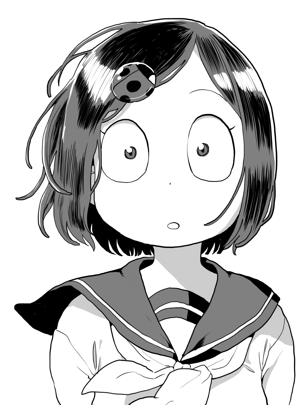 1girlblushforeheadgreyscalehair ornamenthaircliplooking at viewermonochromeneckerchiefparted bangssailor collarschool uniformserafukushirtsimple backgroundsoloupper bodywhite background