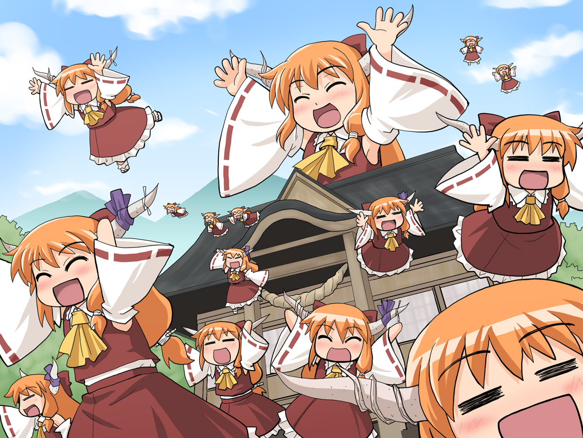 6+girlsarms upblushbowclosed eyescosplaydetached sleevesfemale focushakurei reimu (cosplay)hornsmultiple girlsnecktieopen mouthribbonsandalsshrinezouri