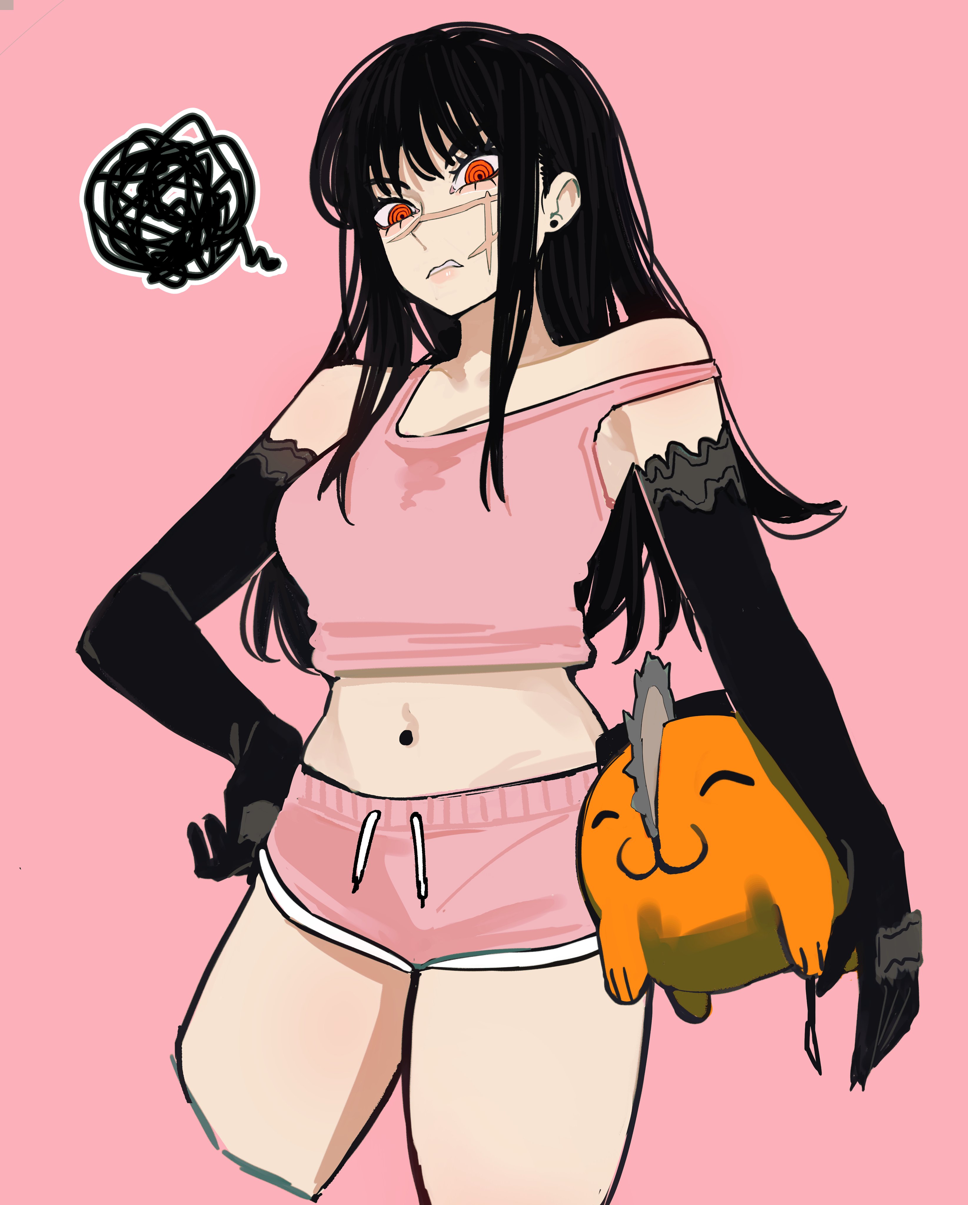 1girlanimalannoyedblack hairdogelbow glovesgloveshand on own hiphappyholdingholding animallong hairlooking at viewerpink backgroundpink shirtpink shortsred eyesringed eyesscarscar on faceshirtshorts