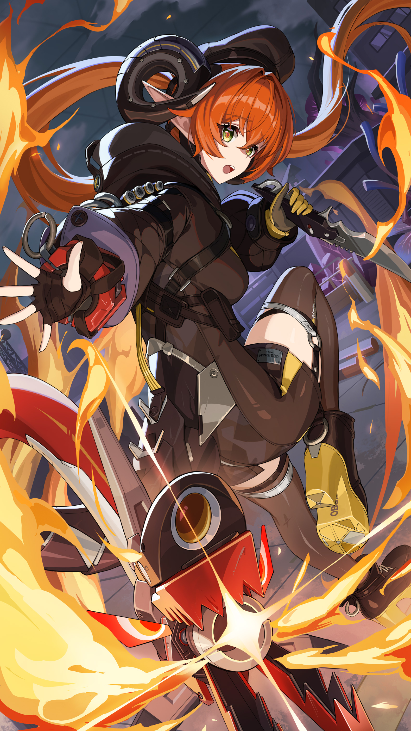 1girlasymmetrical glovesblack bootsblack glovesblack hoodieblack hornsblock heelsbootsbreastsbuildingcurled hornsdragon girldragon hornsdragon taildutch anglefingerless glovesfireglovesgreen eyeshair intakeshand uphatholdingholding knifehoodhoodiehornsindustrial pipeknifeleg uplong hairlong sleeveslooking aheadmechanical hornsmechanical tailmedium breastsmismatched glovesnightopen handopen mouthorange hairorange pupilsoutstretched armplatform bootspointy earspouchsingle fingerless glovesolotailteeththighhighsthighstile floortilestwo-sided glovesupper teeth onlyvery long hairyellow gloves