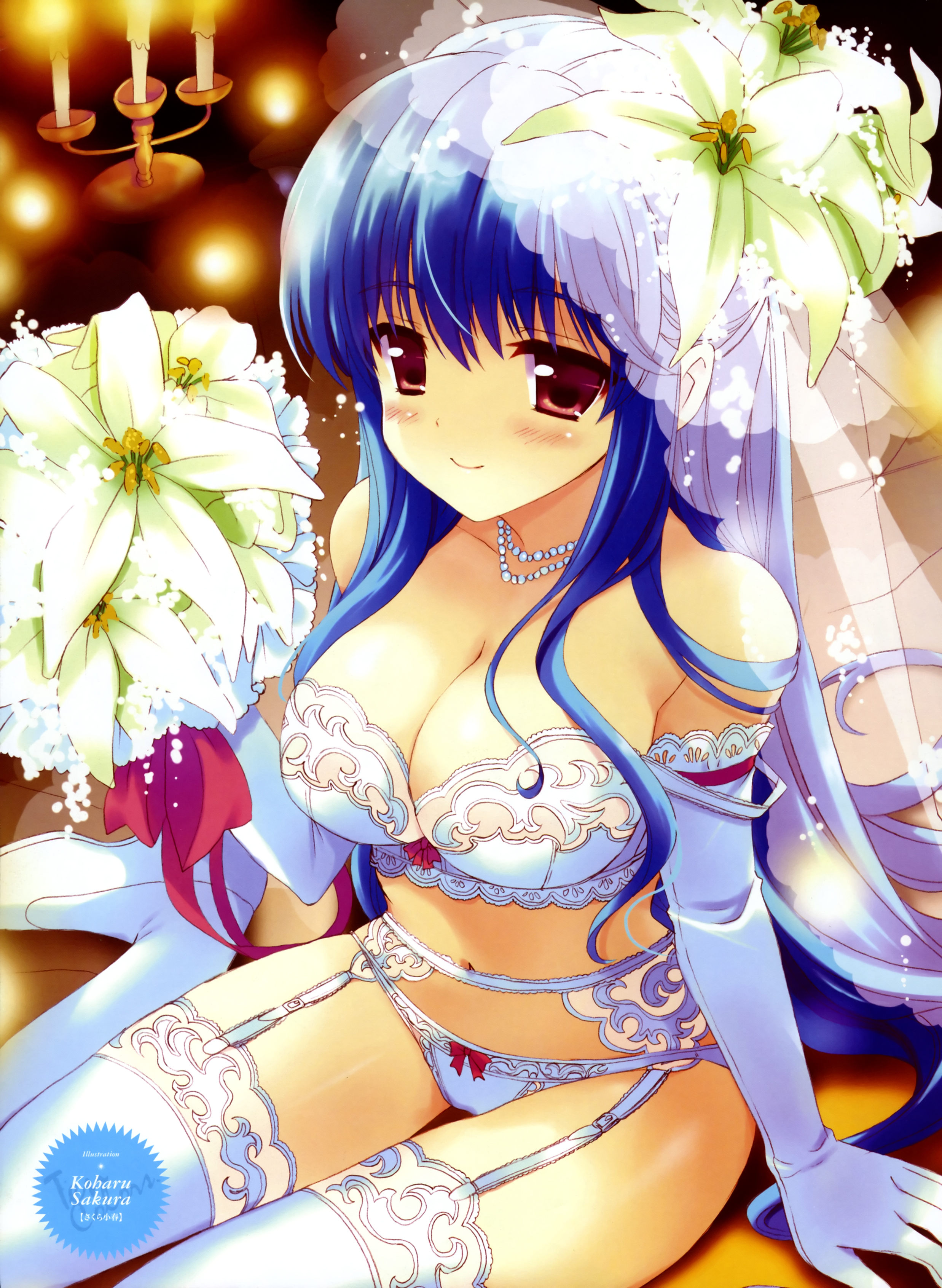 1girlarm supportblue hairblushbouquetbrabreastsbridal veilcleavageelbow glovesfemale focusflowergarter beltgarter strapsglovesjewelrylacelace trimlarge breastslegslily (flower)lingerielong hairlooking at viewernavelnecklacepantiesred eyessittingsolothigh gapthighhighsthighsunderwearunderwear onlyveilwhite pantieswhite thighhighs