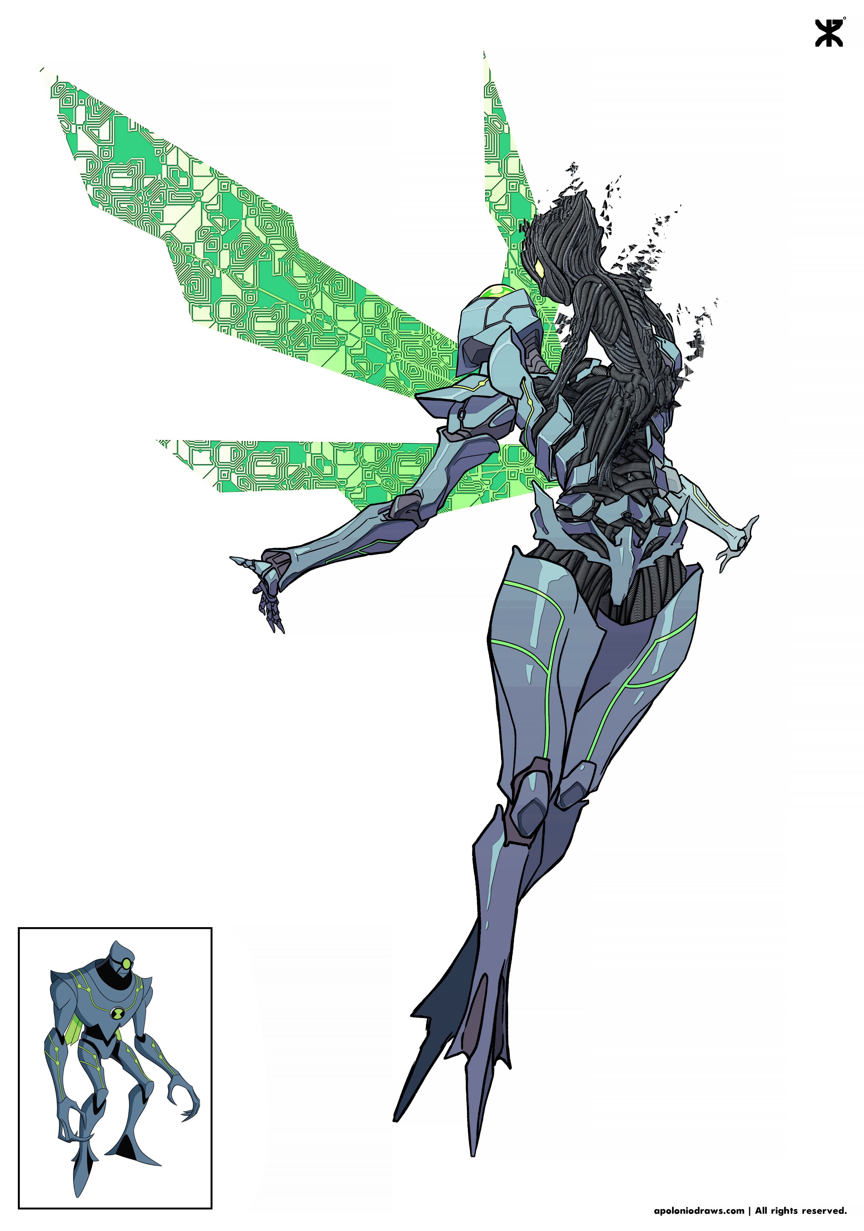 exoskeletongreen eyesgreen linesmechanical armsmechanical legsmechanical wingsmetal skinnanomech (ben 10)omnitrixwings
