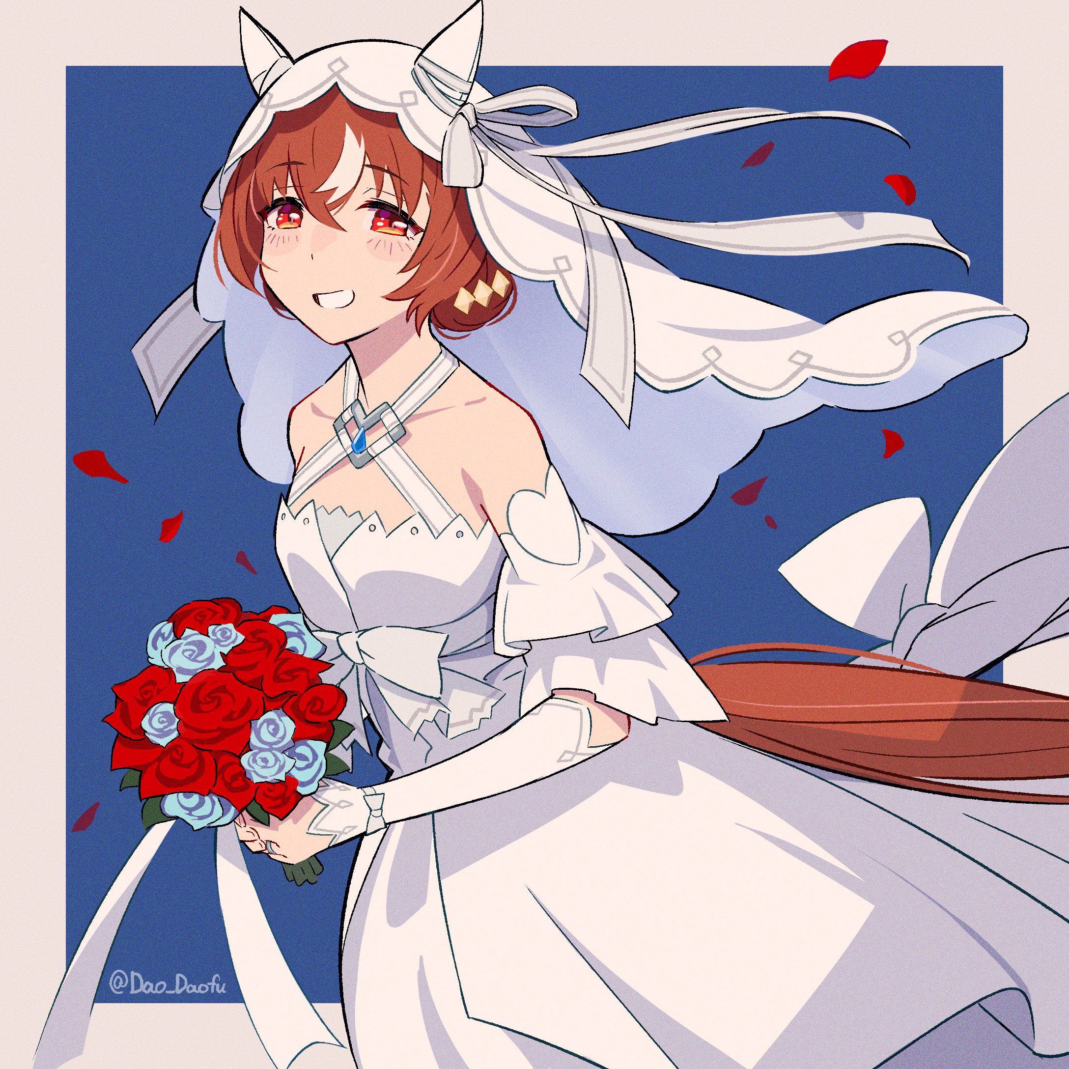1girlalternate costumealternate hairstyleanimal earsblushbreastsbridal veilcollarbonedressflowergrinhair between eyeshair ornamenthorse earshorse girlhorse taillong hairlooking at viewerpetalssmall breastssmilesolotailtwitter usernameveilvestwedding dress
