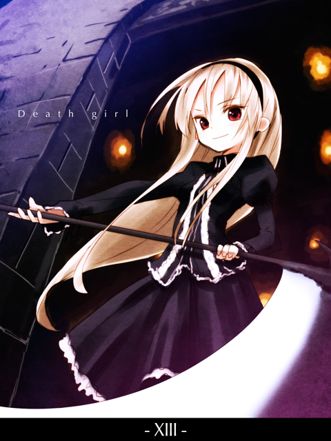 1girlblack dresscowboy shotdressfemale focusfireglinthairbandlong hairlong sleeveslooking at viewerred eyesscythesidelockssolostanding