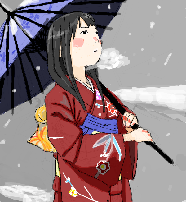 1girlblack hairblushfemale focusfloral printfloral print kimonojapanese clotheskimonolooking upoil-paper umbrellaprint kimonosnowsoloumbrella
