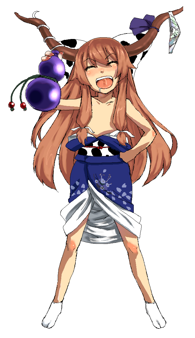 1girlbrown hairclosed eyesclothes downdrunkfemale focusgourdhand on own hiphornsjapanese clotheskimonolong hairopen mouthpantiessockssolotabitopless femaleunderwear