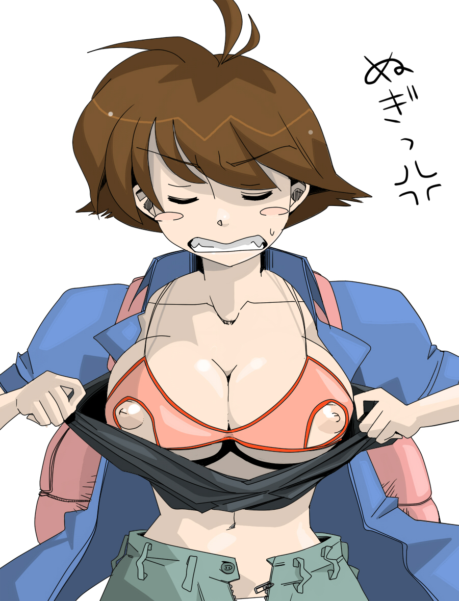 1girlbikinibreastsbrown hairclothes pullfemale focuslarge breastsmidriffnavelnippleless clothesnipplesshirt pullsoloswimsuitundressing