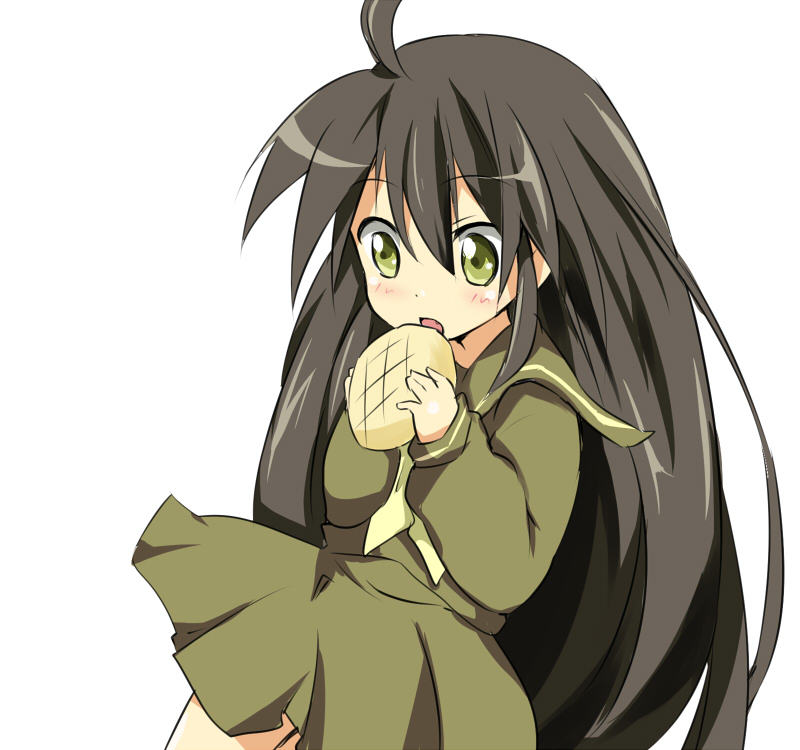 00s1girlblack hairblushbreadfemale focusfoodgreen eyeslong hairmelon breadschool uniformskirtsolo