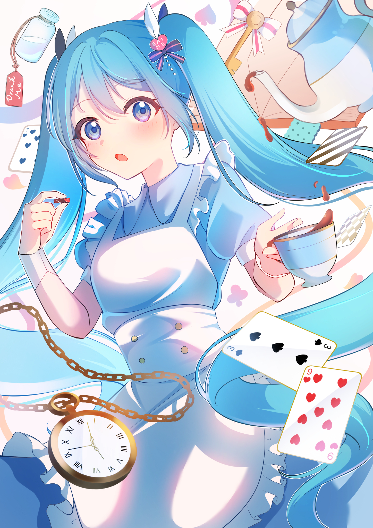 1girlapronaqua dressaqua eyesaqua haircardchocolatecupdressfoodfrilled apronfrillshair between eyeshair ornamenthair ribbonholdingholding chocolateholding cupholding foodkeylong hairlooking at viewermaid apronopen mouthpocket watchribbonroman numeralshort sleevessoloteacupteapottwintailsvery long hairwatchwhite apron