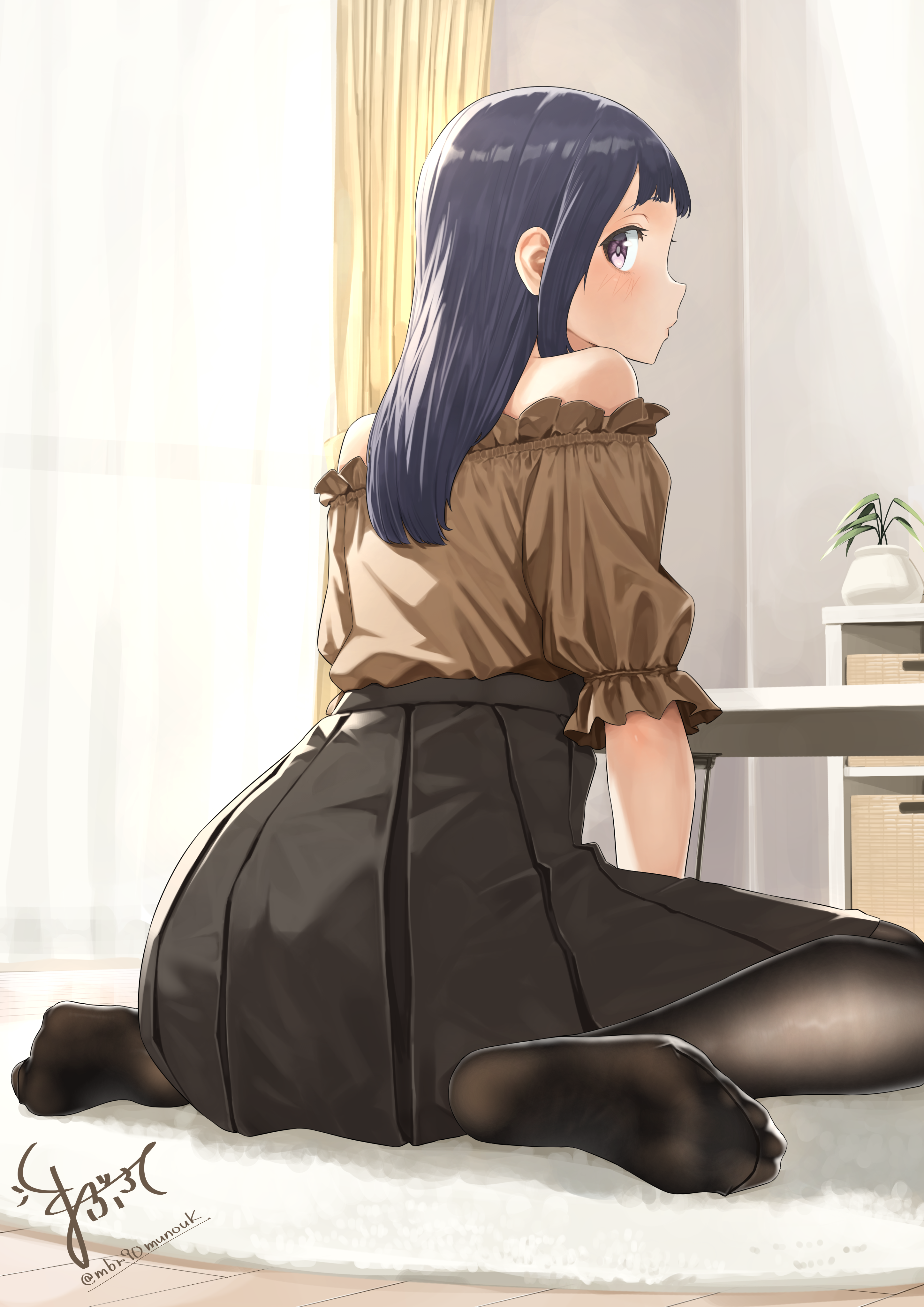 1girlbare shouldersblack hairblack pantyhoseblack skirtblushbrown shirtcurtainsdeskfeetfrom behindhigh-waist skirtindoorslong hairlooking at vieweroff shoulderoff-shoulder shirtpantyhoseplantpotted plantpuffy short sleevespuffy sleevespurple eyesrugshirtshirt tucked inshort sleevessignaturesittingskirtsolessolotoe seamtoestwitter usernamewarizawindow