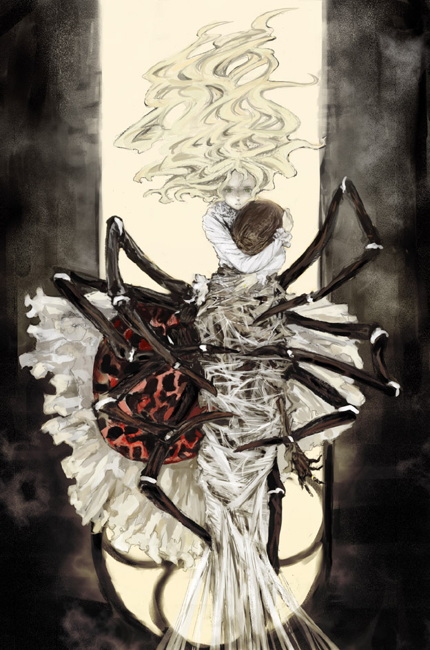 1girlarthropod girlblonde hairbounddresshuginsect girlmonster girlsilkspider girlspider webtied up (nonsexual)upside-down
