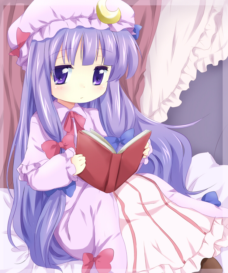 1girlaged downblushbookborderbowcrescent hat ornamentdressfemale focushathat ornamentlong hairopen bookpink bowpurple eyespurple hairreadingsolo