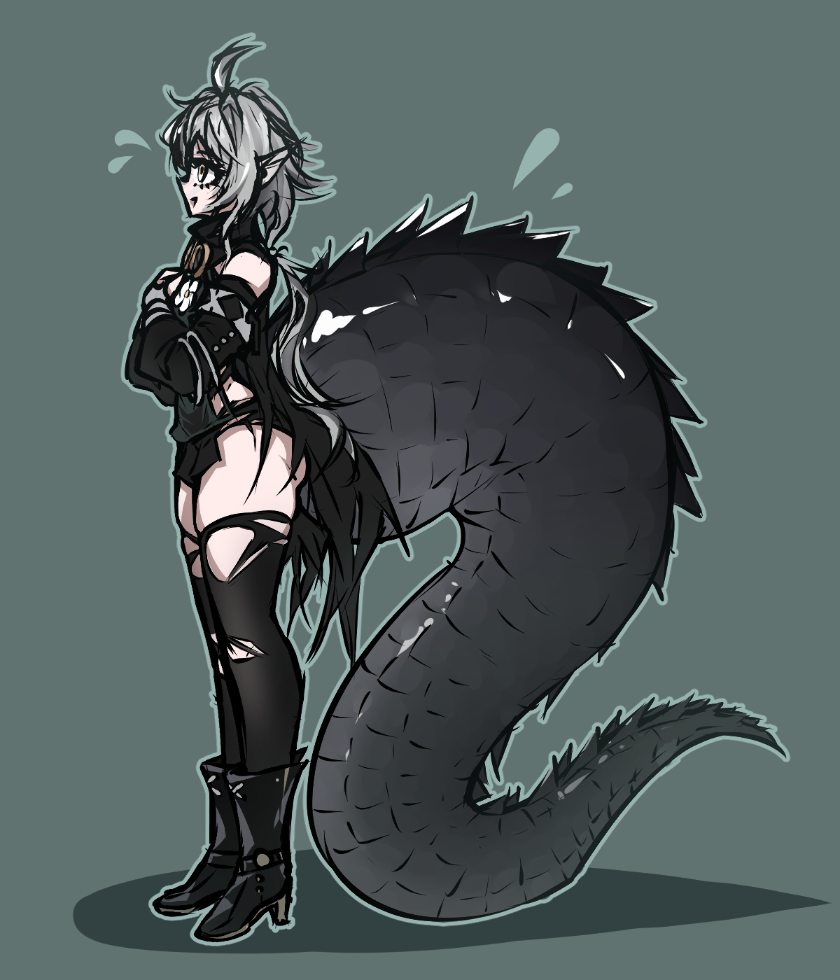 1girlahogebare shouldersblack bootsblack thighhighsbootscrocodilian tailfrom sidegreen backgroundgrey hairgrey taillarge taillong hairoutlineparted lipspointy earssimple backgroundsolotailthighhighstorn clothestorn thighhighs