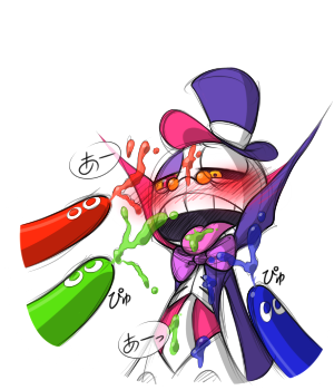 duskyhallows, crow (sanguine rose), sanguine rose, 1boy, 1girl, black hair, brown eyes, character name, colored skin, completely nude, cum, cum on body, english text, facial, green skin, hetero, long hair, looking at viewer, nude, open mouth, solo focus