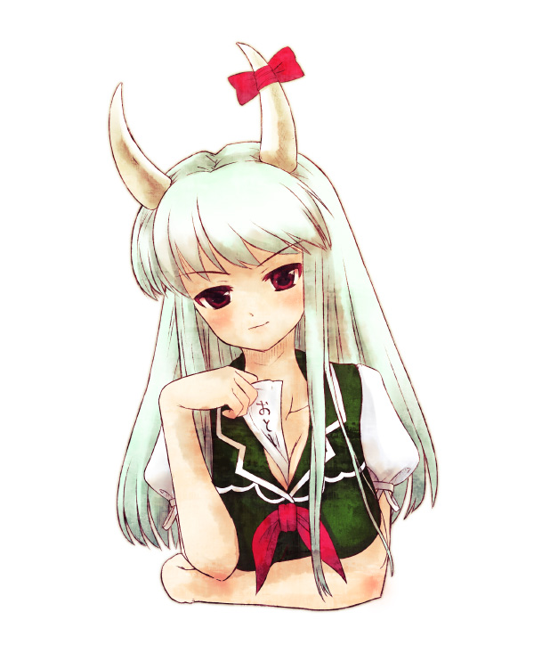 1girlbetween breastsbreastscleavagefemale focushornspaperribbonsimple backgroundsoloupper bodywhite background