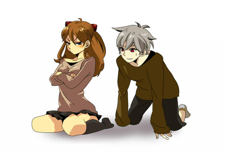 1boy1girlall foursblue eyescouplecrossed armsgrey hairhair ornamenthairclipheterokneelingorange hairpoutred eyesskirtsockssweatertsundere