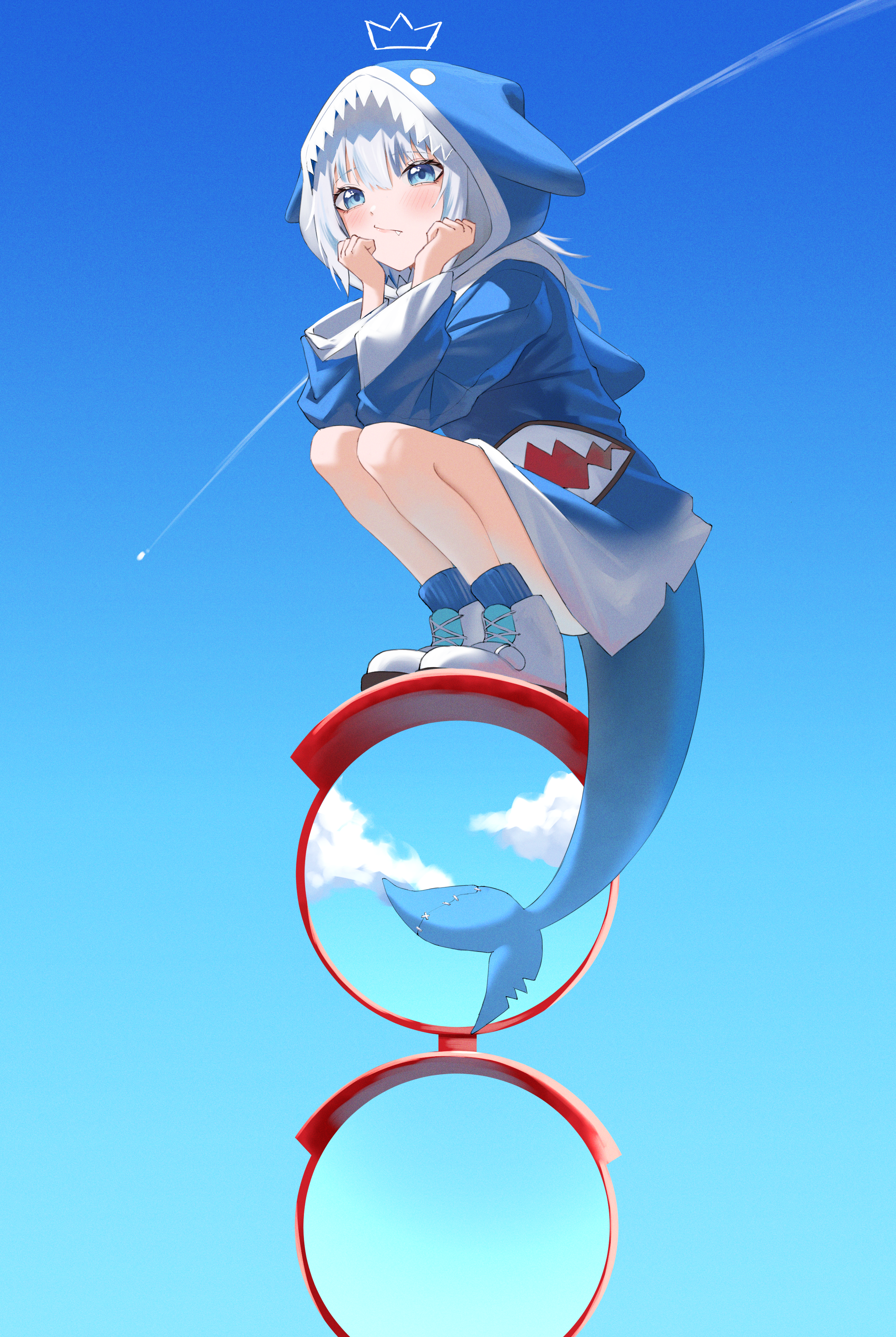 1boy1girlanimal costumeanimal hoodblue eyesblue hairblue hoodieblue skyblue socksclosed mouthcontraildaydrawn crownfinsfish tailfull bodygrey hairhands uphoodhood uphoodielong hairlong sleevesmulticolored hairno pantsoutdoorsshark costumeshark girlshark hoodshark tailshoesskysneakerssockssolosquattingstreaked hairtailtraffic mirrorvirtual youtuberwhite shoes
