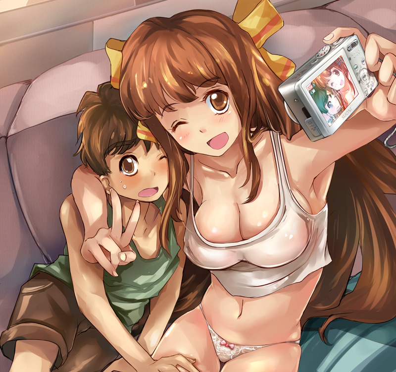 1boy1girlarmpitsblushbreastsbrother and sisterbrown eyesbrown haircameracleavagehair ribbonlarge breastslong hairnavelone eye closedpantiesribbonselfiesiblingstank topunderwearvwink