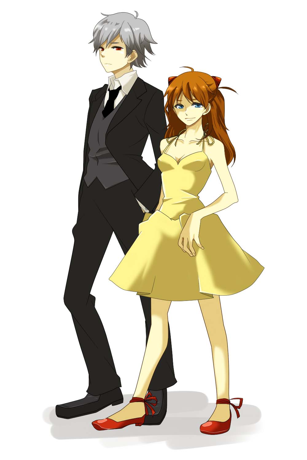 1boy1girlblue eyescoupledressformal clothesgrey hairhair ornamenthairclipheight differenceheteronecktieorange hairred eyesshoessuityellow dress